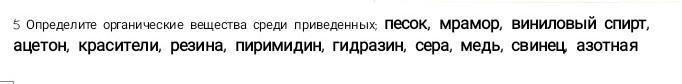 Ответ: виниловый спирт, ацетон, красители, резина, пиримидин