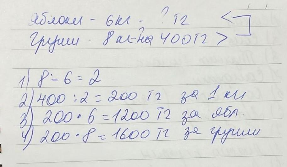 Яблоки и груши одинаковая цена яблок 6кг груш 8кг стоимость яблок не известно а груш на 400,ТГ больше помогите пожалуйста