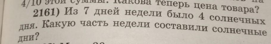 2161) Из 7 дней недели было 4 солнечных Дня. Какую часть недели составили солнечные дни?