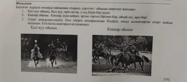 Жазылым Берілген күрделі сөздерді пайдалана отырып, суреттегі ойынды сипаттап жазыңыз 1. Қыз қуу ойыны, Кыз қуу, ерік-жігер, у-шу,бірін-бірі қуып. 2. Көкпар ойыны. Көкпар, күш-қайрат, артыс-тартыс, бірінен-бірі, айқай-шу, ары-бері 3. Cпорт денсаулык-кепілі. Осы пікірге көзкарасыңды білдіріп, өзінді кызыктырған спорт жайлы жазыныз. Етістіктің шактарын колданыңыз. Қыз қуу ойыны. Кокпар ойыны