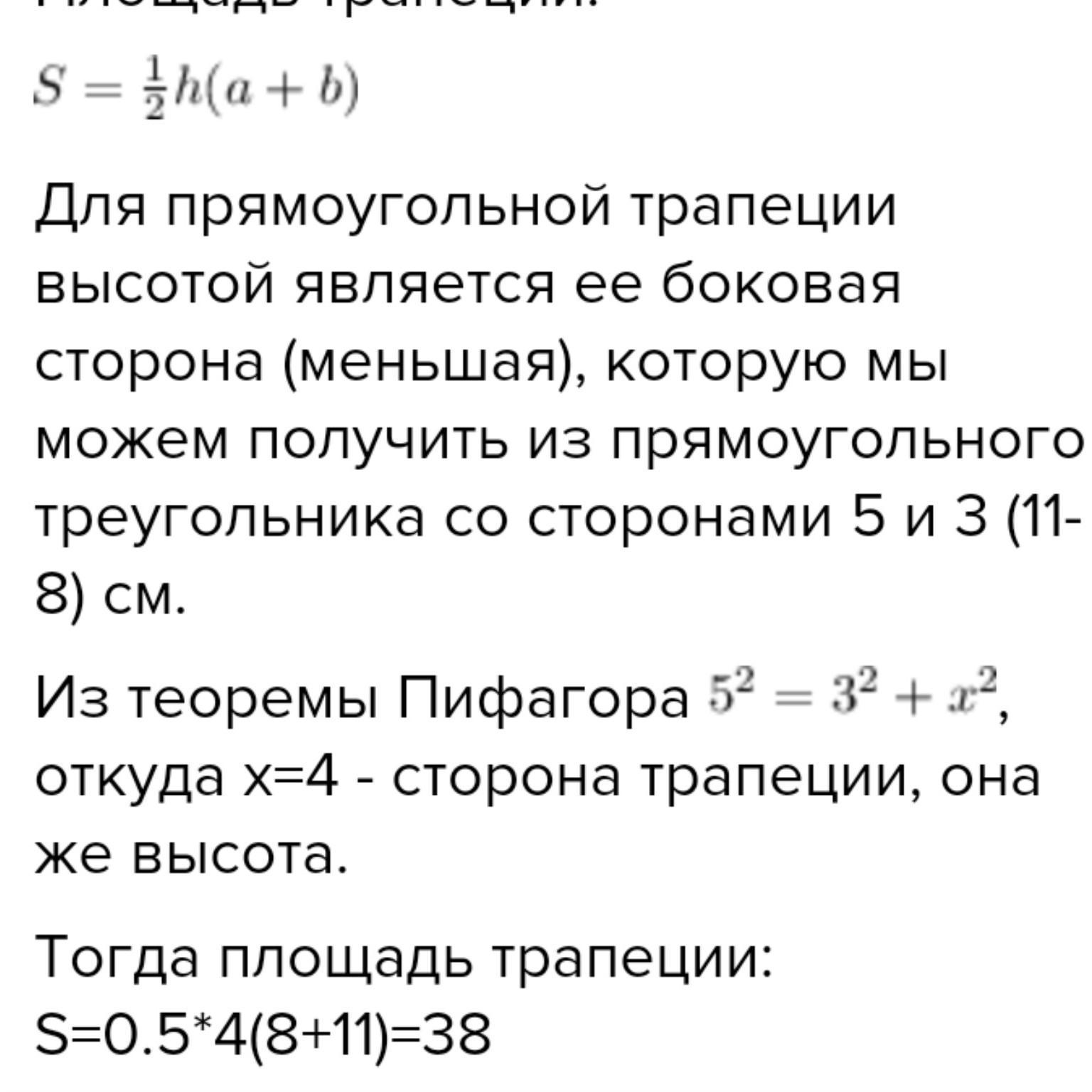 ответ: 38 см² равна площадь равнобедренной трапеции.