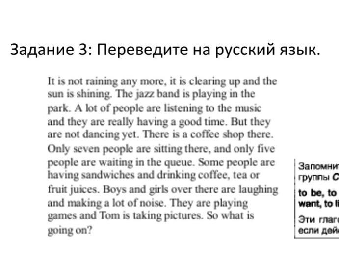 Дождя больше нет, проясняется и светит солнышко. В парке играет джаз-бэнд. Многие люди слушают музыку и действительно хорошо проводят время. Но они еще не танцуют. Там есть кофейня. Там сидят всего семь человек, а в очереди только пять человек. Некоторые люди едят бутерброды и пьют кофе, чай или фруктовые соки. Мальчики и девочки там смеются и много шумят. Они играют в игры, а Том фотографирует. Так, что происходит?