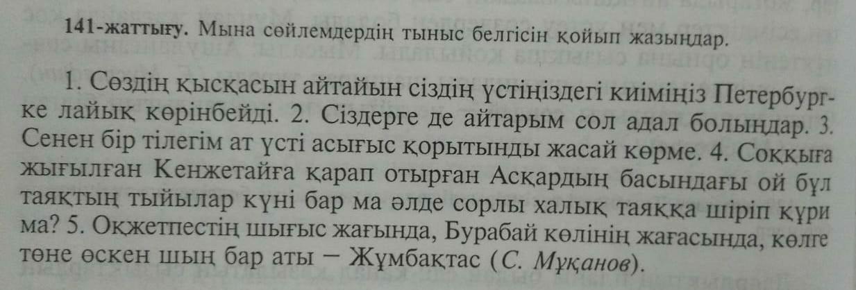 1. Создiн қысқасын айтайын , сiздiн үстiнiздегi киiмiңiз, Петербург ке лайык көрінбейдi . 2. Сіздерге де айтарым сол адал болыңдар . 3 . Сенен бiр тiлегiм , ат үсті асығыс қорытынды жасай көрме . 4. Соққыга жыгылған Кенжетайга карап отырған , Асқардың басындағы ой бұл таяқтын тыйылар күні бар ма әлде сорлы халық таяққа шіріп күри ма ? 5. Оқжетпестің шығыс жағында , Бурабай көлінің жағасында , келге төне өскен шың бар аты Жұмбақтас ( С. Мұқанов ) .