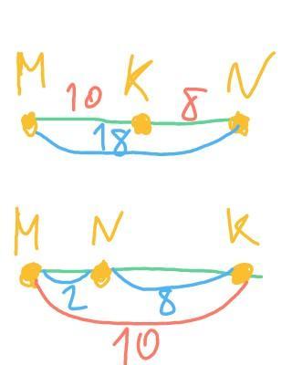 Найдите длину отрезка MN если M N K лежат на одной прямой и MN 10 см NK 8 см