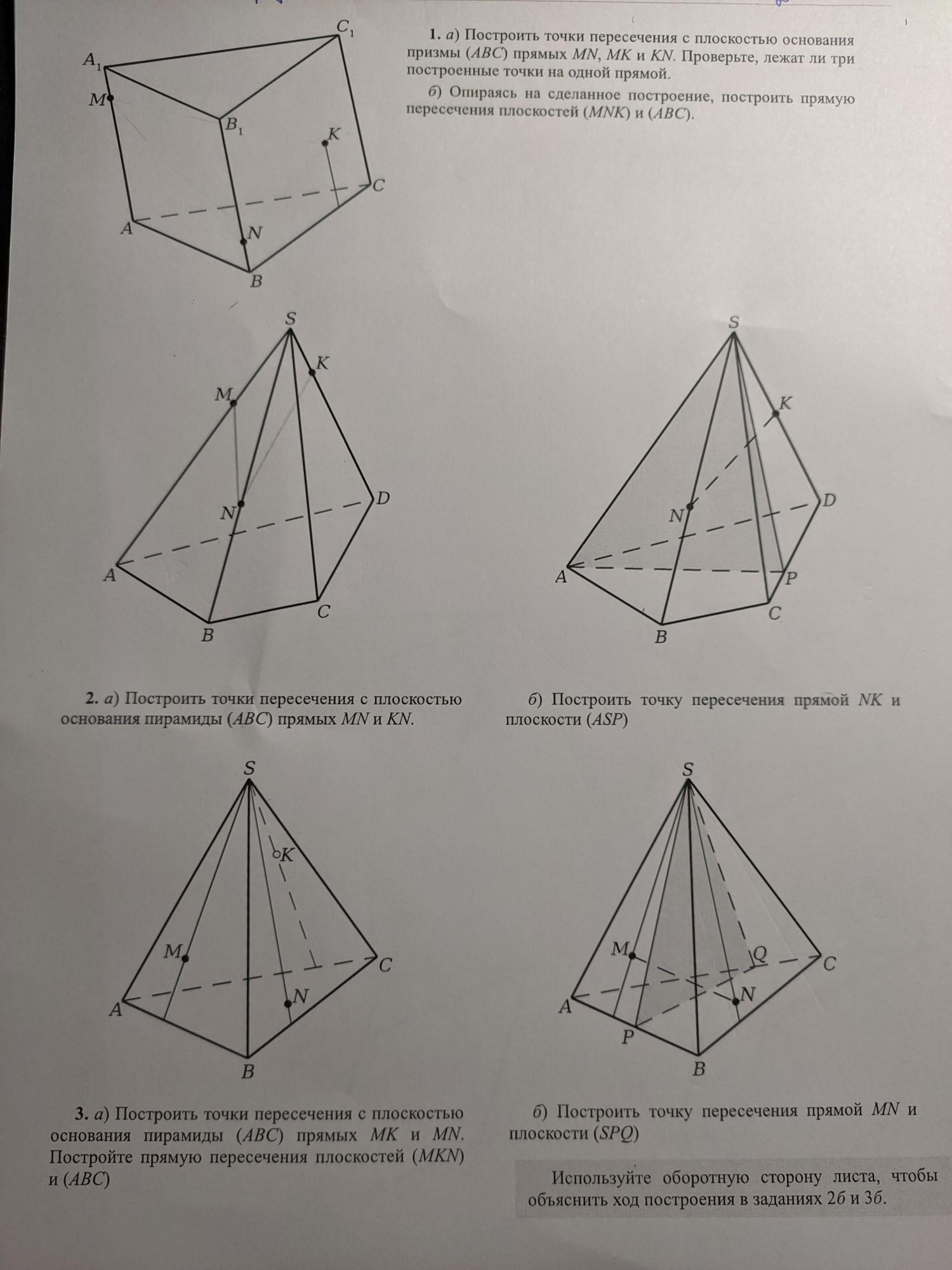 Для нахождения точки пересечения прямой МК с АВС надо призму рассечь дополнительной плоскостью АМК.