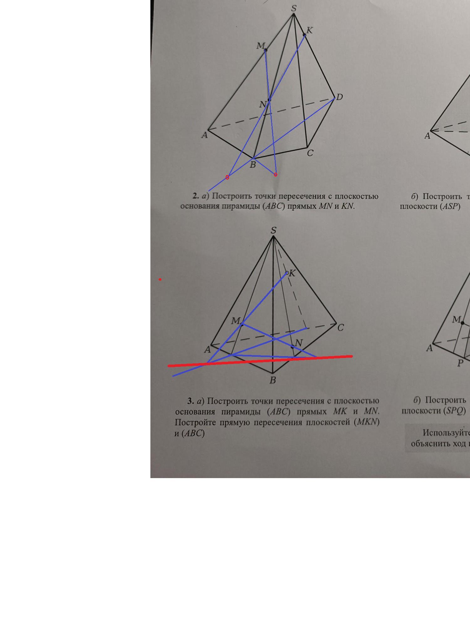 Точки пересечения прямых MN и KN находятся на продолжении рёбер АВ и ВС.