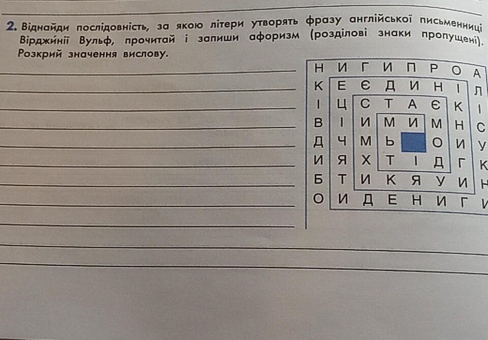 2. Віднайди послідовність, за якою літери утворять фразу англійської письменниці Вірджинії Вульф, прочитай і запиши афоризм (розділові знаки пропущені). Розкрий значення вислову.
