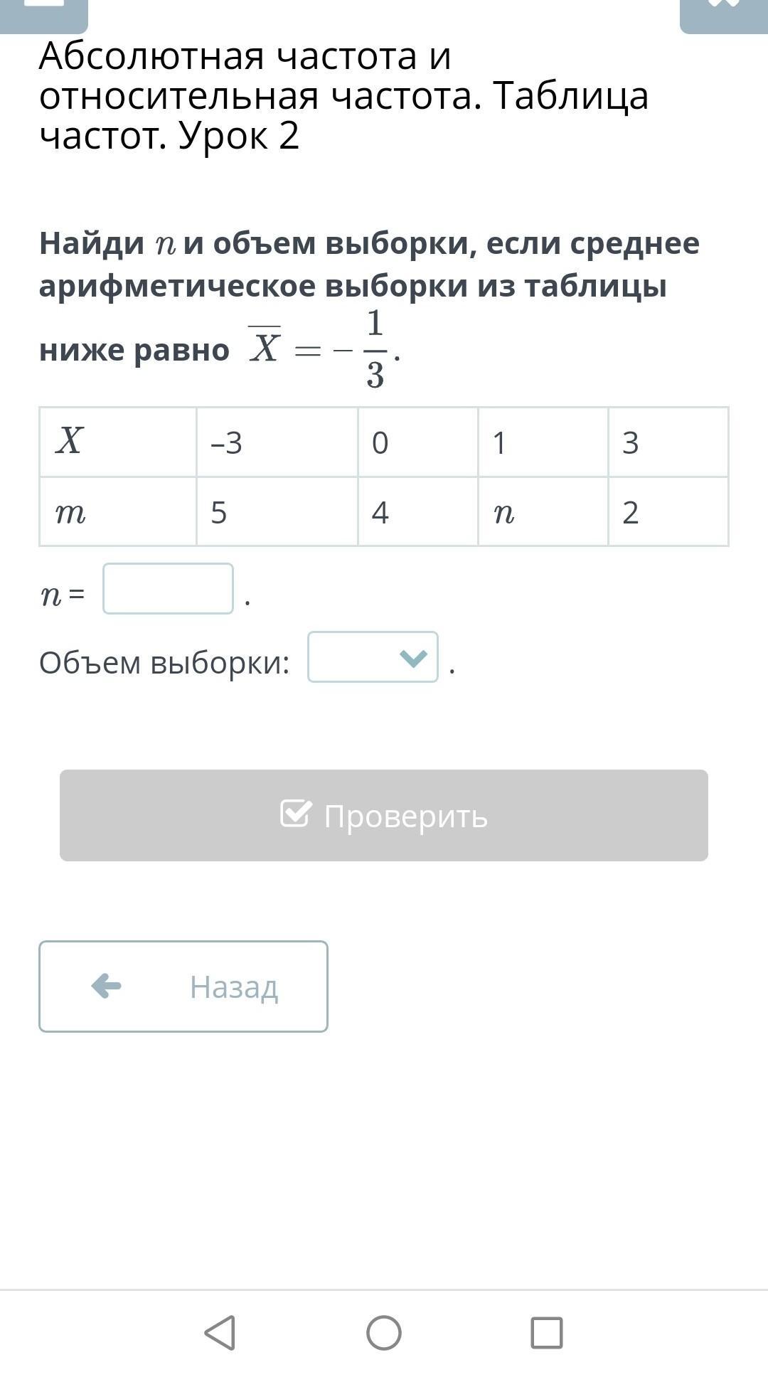 Найди n и объем выборки, если среднее арифметическое выборки из таблицы ниже равно X=-1/3 X:-3 0 1 3 m:5 4 n 2 n= Объем=