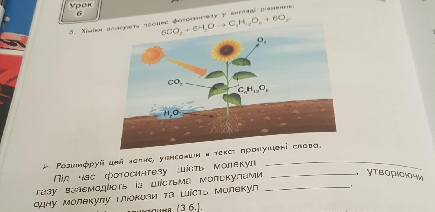 Розшифруй цей запис, уписавши в текст пропущені слова. Під час фотосинтезу шість молекул ____ газу взаємодіють із шістьма молекулами ____, утворюючи одну молекулу глюкози та шість молекул ____.