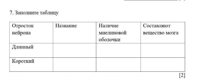 7. Заполните таблицу Отросток Название Наличие Составляют нейрона миелиновой вещество мозга оболочки Длинный Короткий