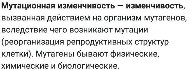 Мутационная изменчивость — изменчивость, вызванная действием на организм мутагенов, вследствие чего возникают мутации (реорганизация репродуктивных структур клетки). Мутагены бывают физические, химические и биологические.