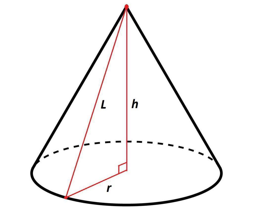 Радиус основания r находим по теореме Пифагора, он является катетом прямоугольного треугольника, в котором гипотенузой и другим катетом являются высота H и образующая L: