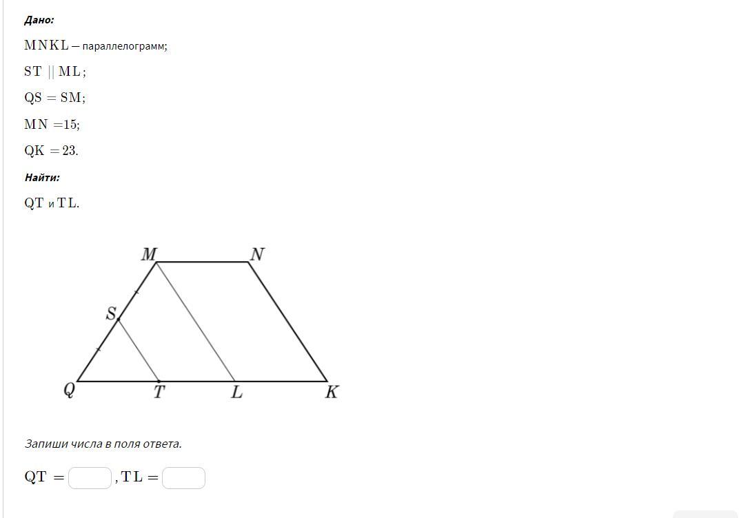 Решите задачу: MNLK - Параллелограмм, ST//ML, остальное на фото