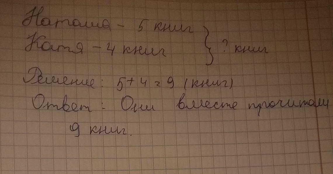 Наташа на каникулах прочитала 5книг а Катя 4книг , сколько дети прочитали книг Вместе на каникулах?задача с условиями , решениями и ответом