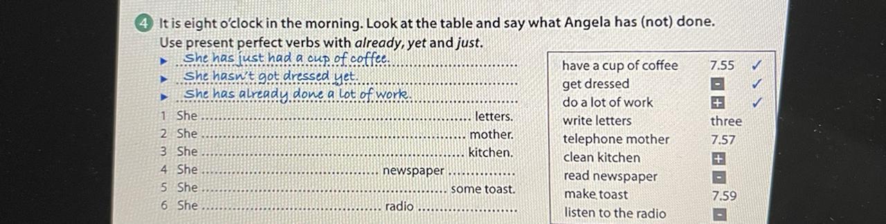 It is eight o'clock in the morning. Look at the table and say what Angela has (not) done.