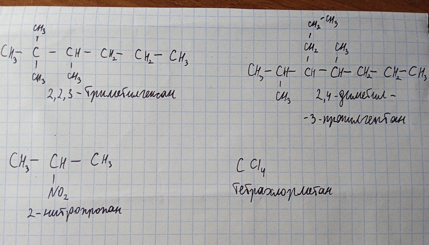 Напишите структурные формулы следующих соединений: 2,2,3-триметилгексан; 2,4-диметил-3-пропилгептан, 2-нитропропан, тетрахлорметан.
