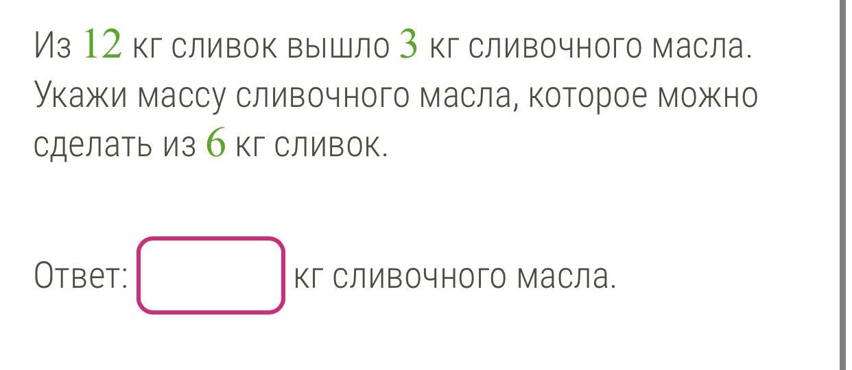 Из 12 кг сливок вышло 3 кг сливочного масла. Укажи массу сливочного масла, которое можно сделать из 6 кг сливок.