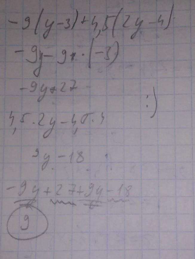 -9(у-3)+4,5(2у-4)= - 9у+27+9у-18=9