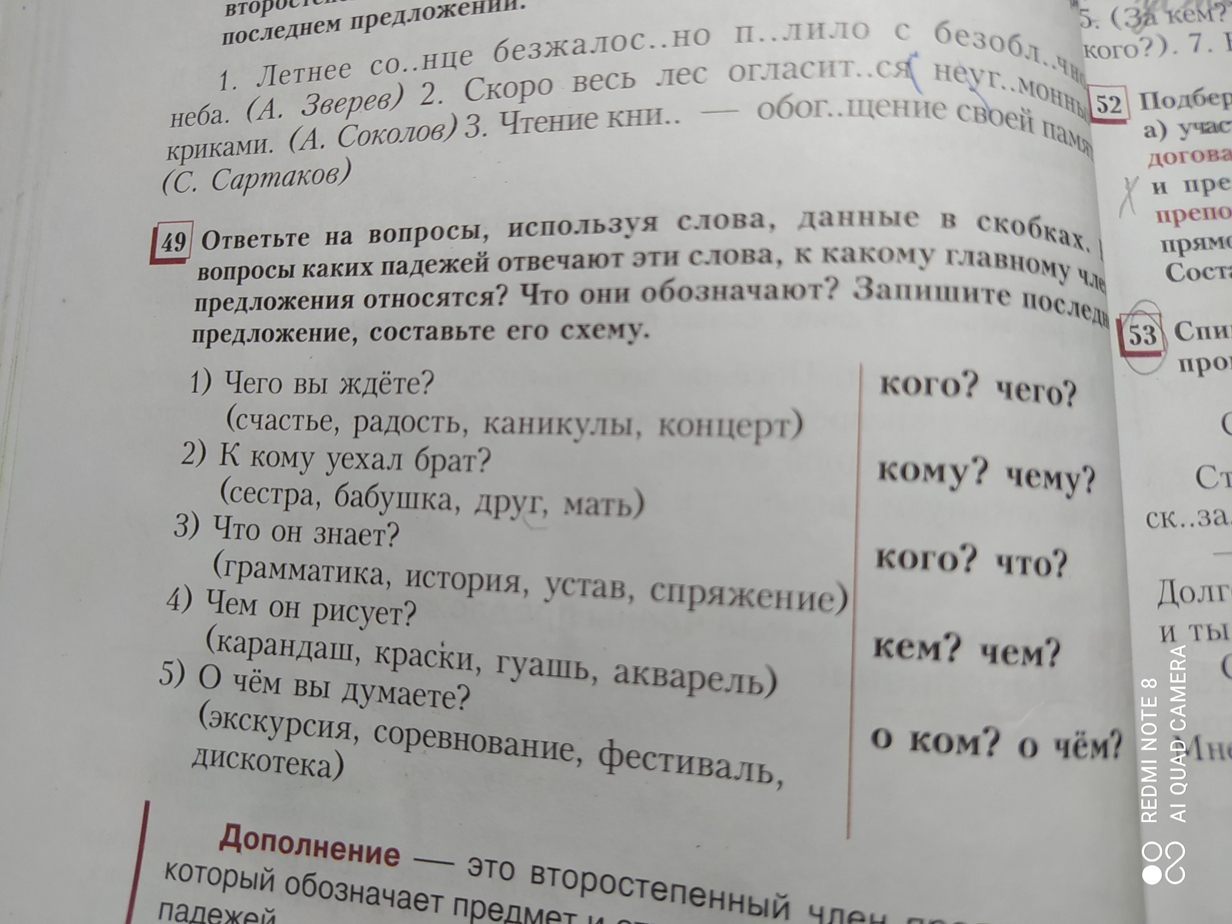 Ответьте на вопросы, используя слова , данные в скобках.На вопросы каких падежей отвечают эти слова,к какому главному члену предложение относятся?Что они обозначают?Запишите последнее предложение, составьте его схему.