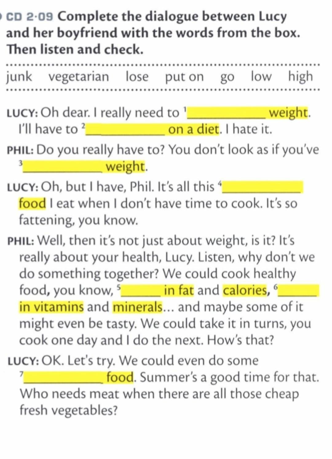 1)lose 2)go 3)put on 4)junk 5)low? 6)high? 7) vegetarian