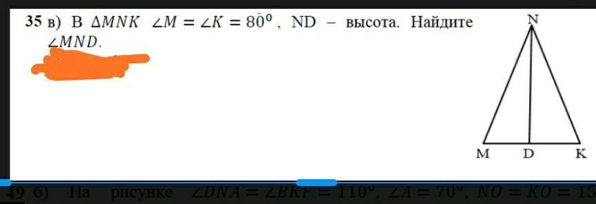 в треугольнике mnk угол M =углу K = 80 градусов,ND-высота