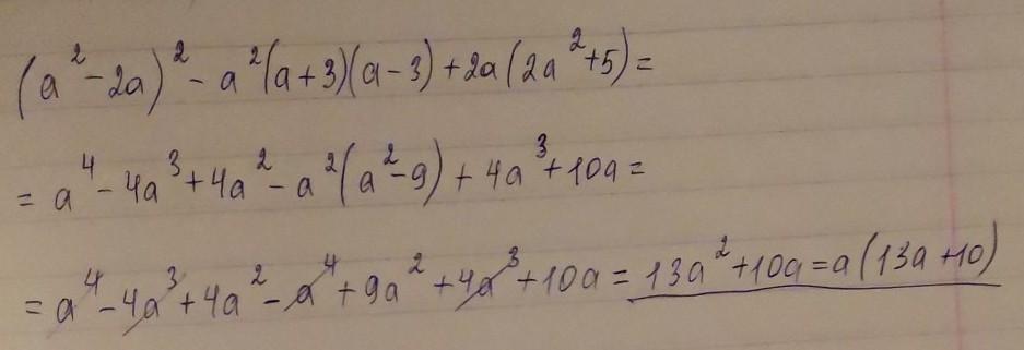 (а²-2а)²-а²(а+3)(а-3)+2а(2а²+5)=а⁴-4а³+4а²-а⁴+9а²+4а³+10а=13а²+10а
