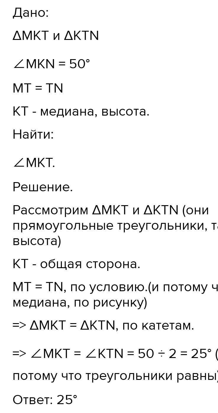 На рисунке изображены треугольники MKT и KTN. Угол MKN равен 50˚. Найдите градусную меру угла MKT.