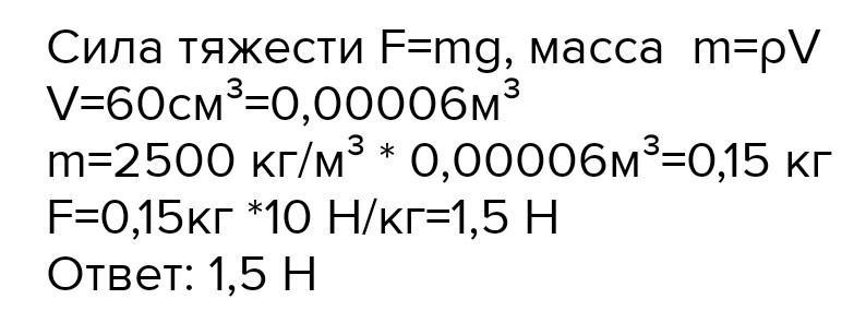 Чему равна сила тяжести, действующая на стеклянный стакан объемом 60 см3? Плотность стекла 2500 кг/м3.