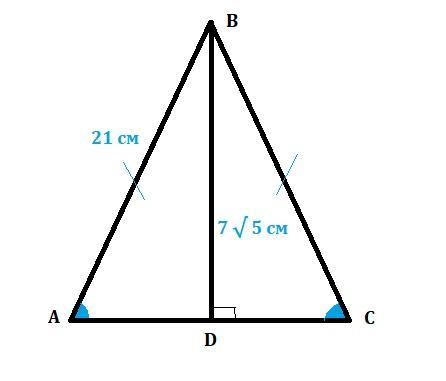 в равнобедренном треугольнике abc с основанием ac боковая сторона ab равна 21 см,а высота BD проведенная к основанию равна 7 корень 5. найдите основание и углы треугольника