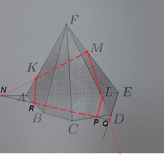 Прямая NQ лежит в плоскости основании (обе точки лежат в этой плоскости), NQ пересекает ребра основания АВ и CD в точках R и P соответственно.