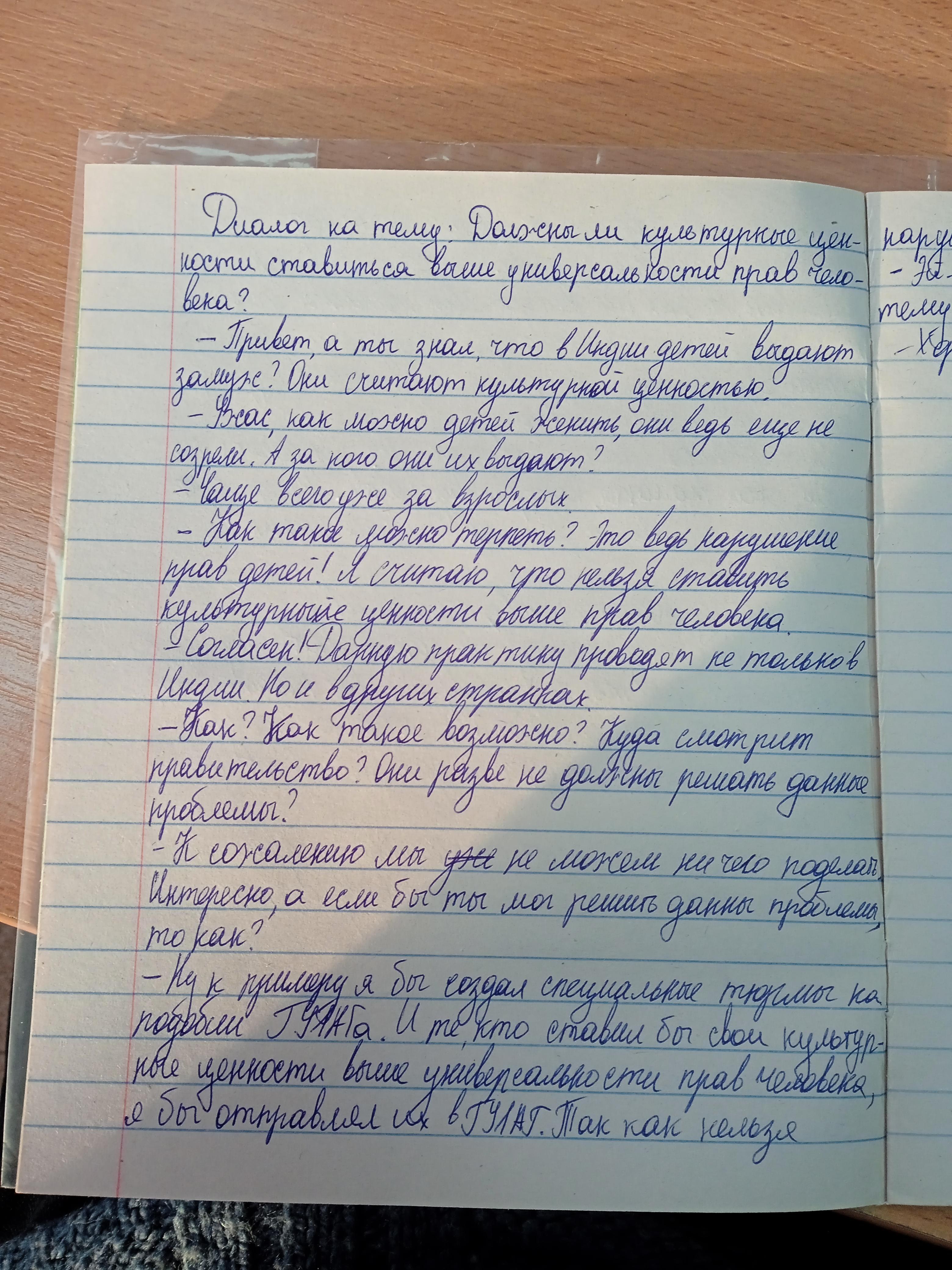 Составьте в парах диалог, ответив на вопрос «Должны ли культурные ценности ставиться выше универсальности прав человека?»