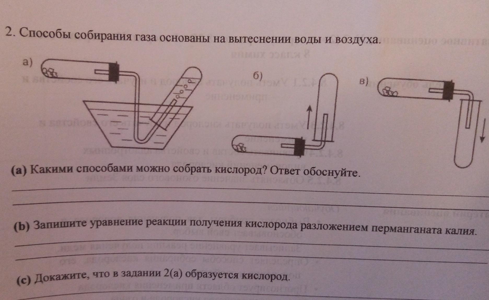 2. Способы собирания газа основаны на вытеснении во a) 6) (а) Какими способами можно собрать кислород? Ответ о (b) Запишите уравнение реакции получения кислорода ра: (c) Докажите, что в задании 2(а) образуется кислород.