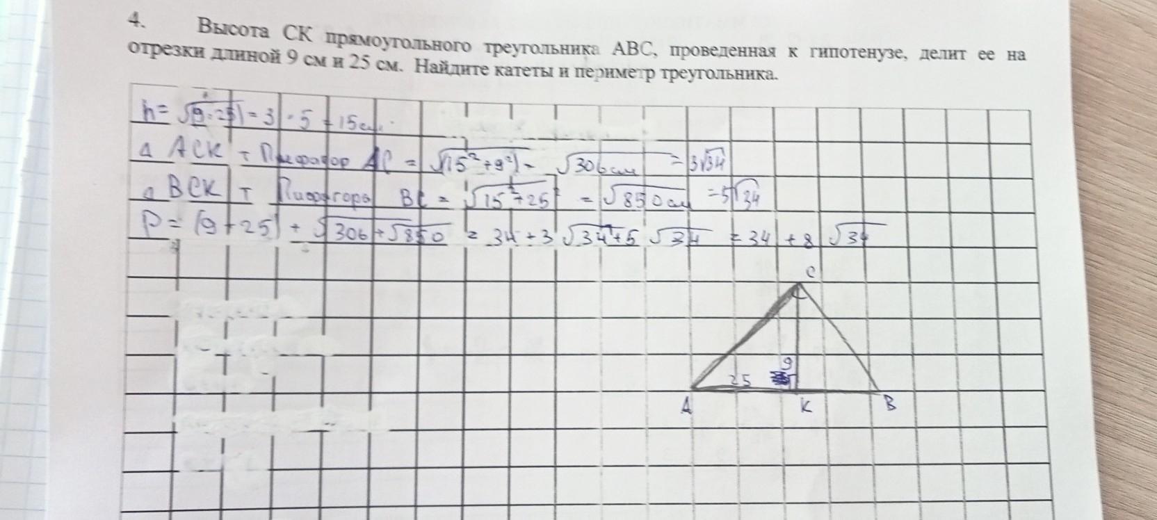 Высота СК прямоугольного треугольника АВС , проведенная к гипотенузе, делит ее на отрезки длинной 9см и 25см. Найдите катеты и периметр треугольника.