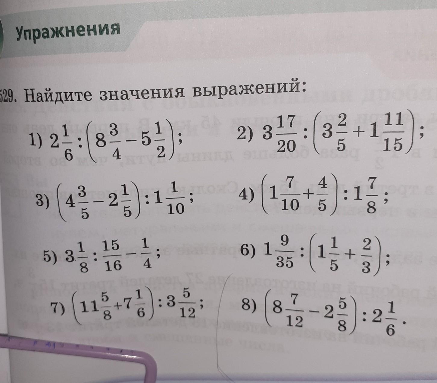529. Найдите значения выражений: 3 у 2 в) за 1): 1) 2855 2 3- +1 15 2) : - 6 4 1 7 4 + 10 5 3) 4 :1 2 4) 1 :1 10 15 : :(11 6) 1-9 5) 3 2 + 5 3 ) 35 8 16 4 7) (11 2 7 5 :3=; 12 76):3 7 8) 8 12 8 6
