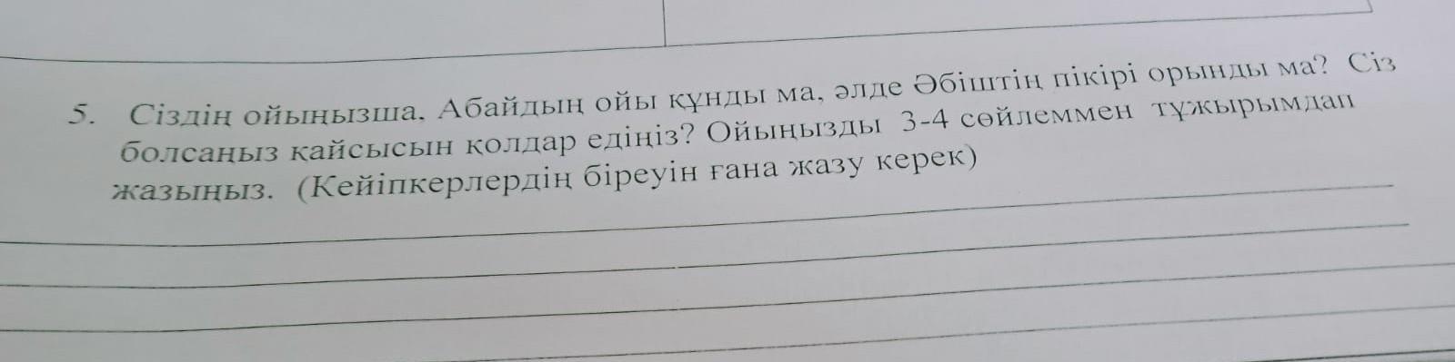 Сіздің ойыңызша.Абайдың ойы құнды ма әлде Әбіштің пікірі орынды ма?Сіз болсаныз қайсысын қолдар едініз?Ойынызды 3-4 сөйлеммен тұжырымдап жазыныз (Кейіпкерлердің біреуін ғана жазу керек)