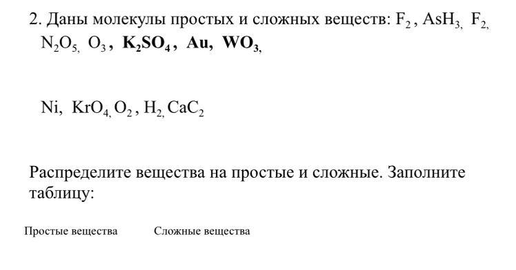 Даны молекулы простых и сложных веществ: F2 , AsH3, F2, N2O5, O3 , K2SO4 , Au, WO3,