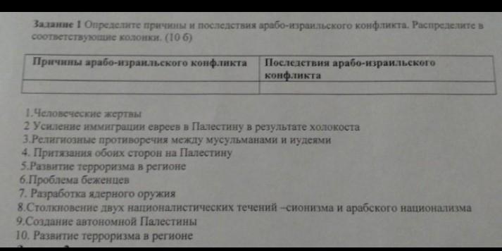 Задание 1 Определите причины и последствия арабо-израильского конфликта. Распределите в соответствующие колонки. (106) Причины арабо-израильского конфликта Последствия арабо-израильского конфликта