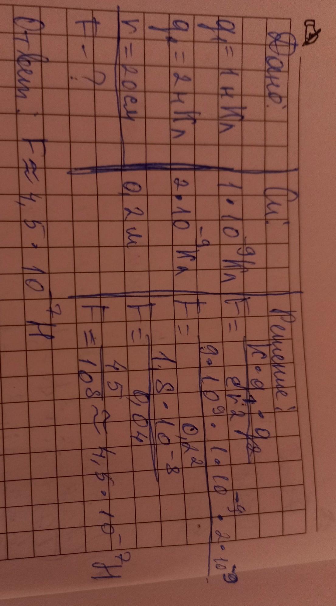 2 4. В вакууме два точечных заряда 1 нКл и 2 нКл , взаимодействуют в вакууме на расстоянии 20см. Определите силу взаимодействия зарядов.