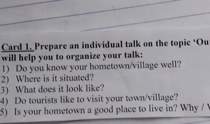 Card 1. Prepare an individual talk on the topic 'Our countryside'. The will help you to organize your talk: 1) Do you know your hometown/village well? 2) Where is it situated? 3) What does it look like? 4) Do tourists like to visit your town/village? 5) Is your hometown a good place to live in? Why / Why not?