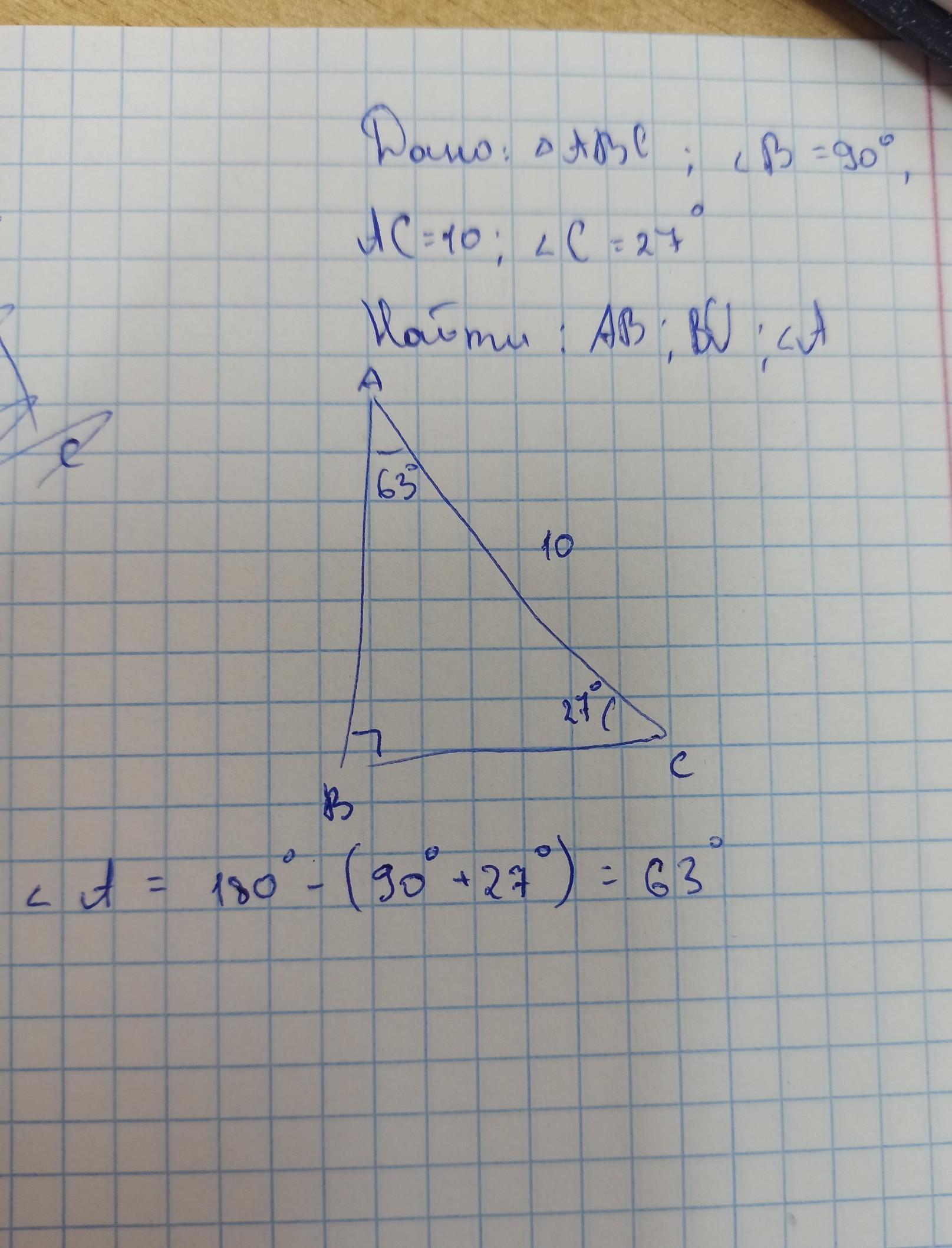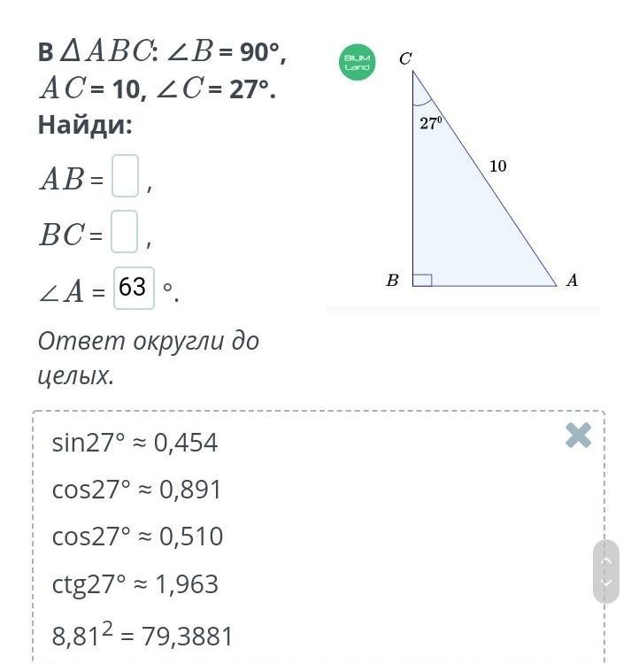 ∆ABC: ∠B = 90°, AC = 10, ∠C = 27°. Найди: AB =, BC =, ∠A =°. Ответ округли до целых.