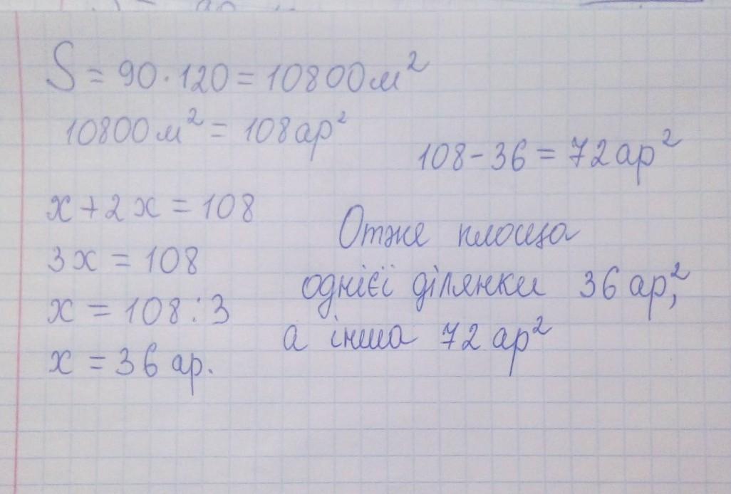 Земельну ділянку прямокутної форми, розміри якої 90 м і 120 м, поділили на дві частини так, що площа однієї частини у 2 рази більша за площу іншої. Знайди площі цих частин в арах
