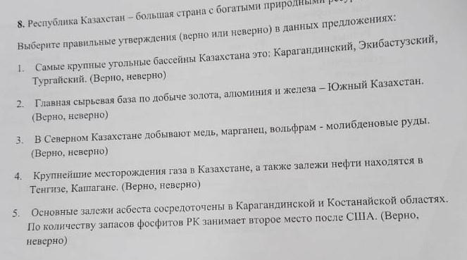 8. Республика Казахстан -бальная страна с богами природными ресурсами. Віхрите правильные утверждения (верни ин наверно) в данных предложениях. санын рутер утасны ангилалтаа та аралашинкина, ибастузский, Тураккий Верю, ненерно) аван санаа алдан авах арга Каталсан Berengu katika дар ин болон талаар ду 12 = Ee ана тааз на да LE ESS адреса канале сата есе они не