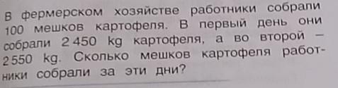 6. В фермерском хозяйстве работники собрали 100 мешков картофеля. В первый день они собрали 2 450 kg картофеля, а во второй 2550 kg. Сколько мешков картофеля работ- наки собрали за эти дни?