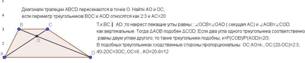 Діагоналі трапеції АВСD перетинаються в точці О.Знайти АО та ОС,якщо периметр трикутників ВОС та АОD відносяться як 2:3 та АС=20.СРОЧНОООО!!