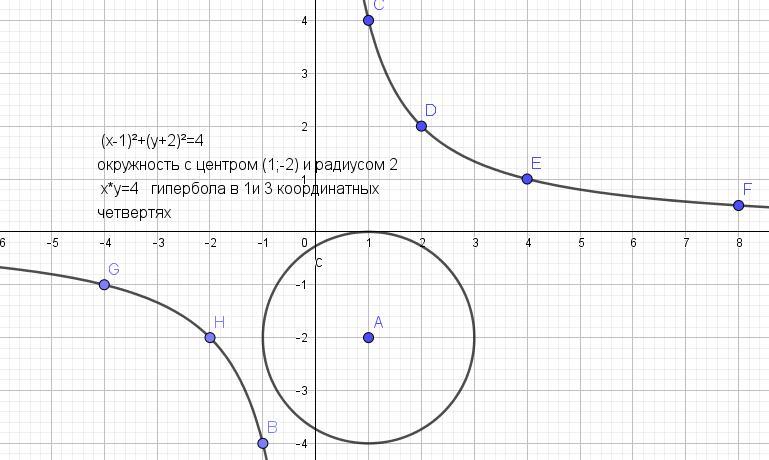 В первом уравнении исправлен знак минус на плюс. Точек пересечения окружности и гиперболы нет. Система не имеет решения