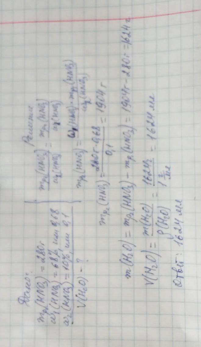 Каким объемом воды следует разбавить 280 г 68% раствора азотной кислоты, чтобы получить 10% раствор?