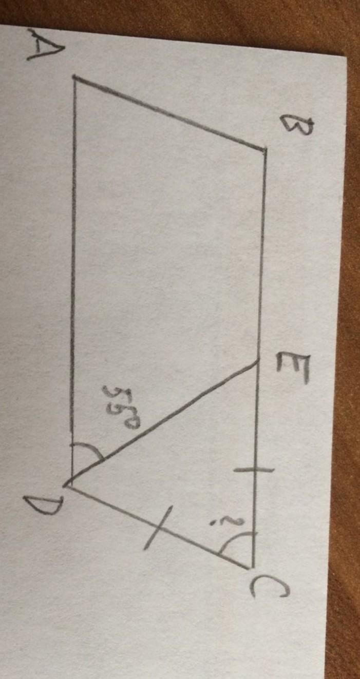 1) AD параллельно ВС, следOBaTeЛbHO угол CED = углу ADE = 55 градусам (как накрест лежащий), следовательно угол CDE = углу CED = 55 градусам, так как треугольник равнобедренный.