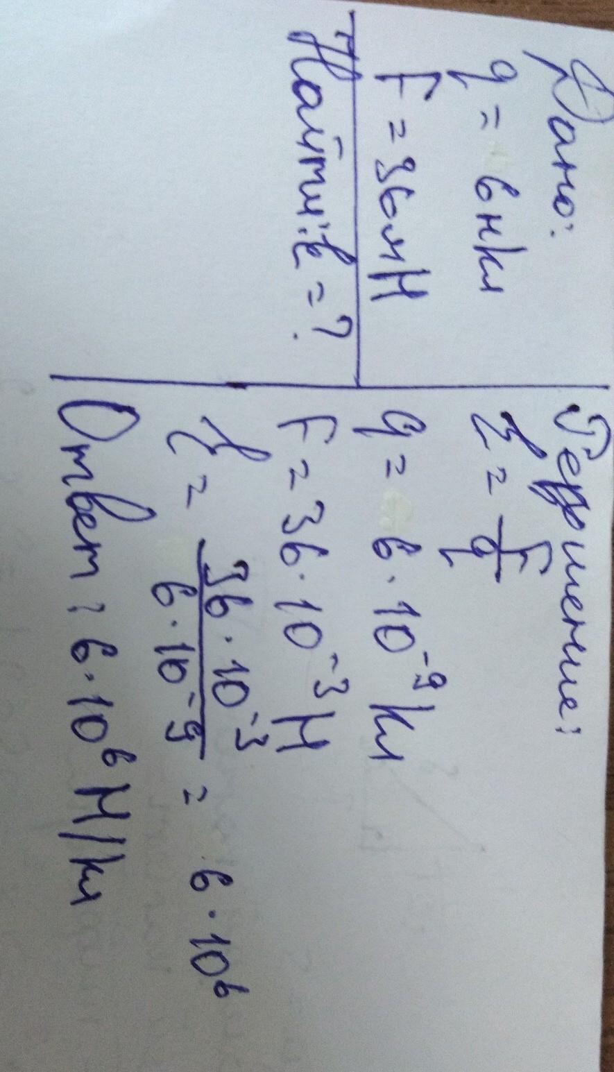 На заряд - 6·нКл в точке С электрического поля действует сила 36 мН. Вычислите какова напряженность поля в точке С