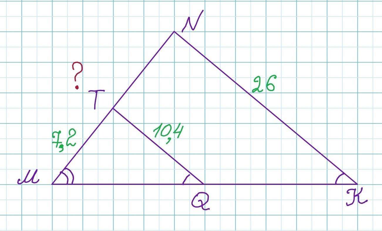 В треугольнике MNK провели прямую, параллельную стороне NK так, что она пересекает стороны MK и MN в точках Q и T соответственно. Найди длину стороны MN, если NK = 26, TQ = 10,4, MT = 7,2.