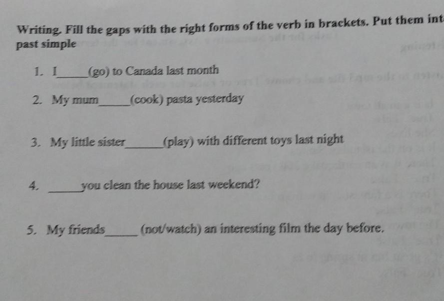 1. I (go) to Canada last month 2. My mum (cook) pasta yesterday 3. My little sister (play) with different toys last night 4. you clean the house last weekend? 5. My friends (not/watch) an interesting film the day before.